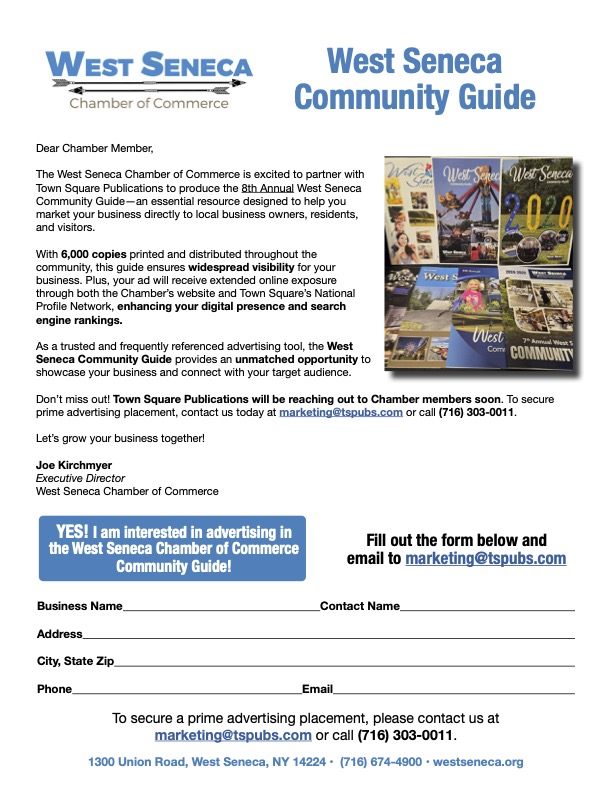Today we are kicking off our 8th annual West Seneca Community Guide … with a twist. This year we are teaming up with the media professionals at Town Square Publications to produce our Community Guide, along with an online version that will enhance your digital presence! So when you receive a call from Town Square Publications regarding advertising in the Guide, please note that it is not a scam and that they are partners with us in the production of this very popular yearly publication.